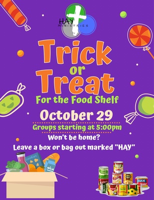 It's almost time for Trick or treat for the Food Shelf. Hutchinson Youth groups will be going around Hutchinson trick or treating for non-perishable items for the food shelf. Students will begin collecting at 5:00pm. If you will not be home, but would still like to donate, leave a bag or box on your front steps marked, HAY Trick or Treat.